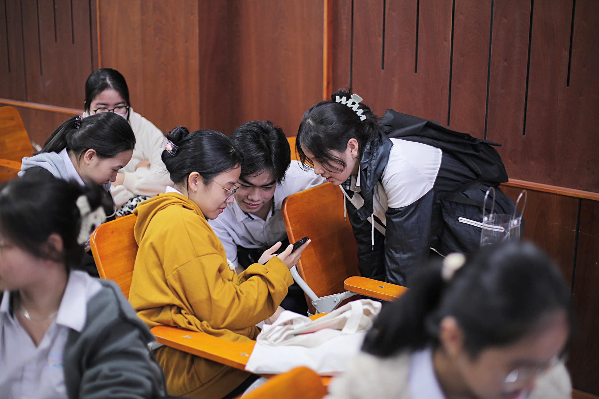 Sinh viên báo chí Huế hào hứng trải nghiệm làm báo bằng smartphone. |