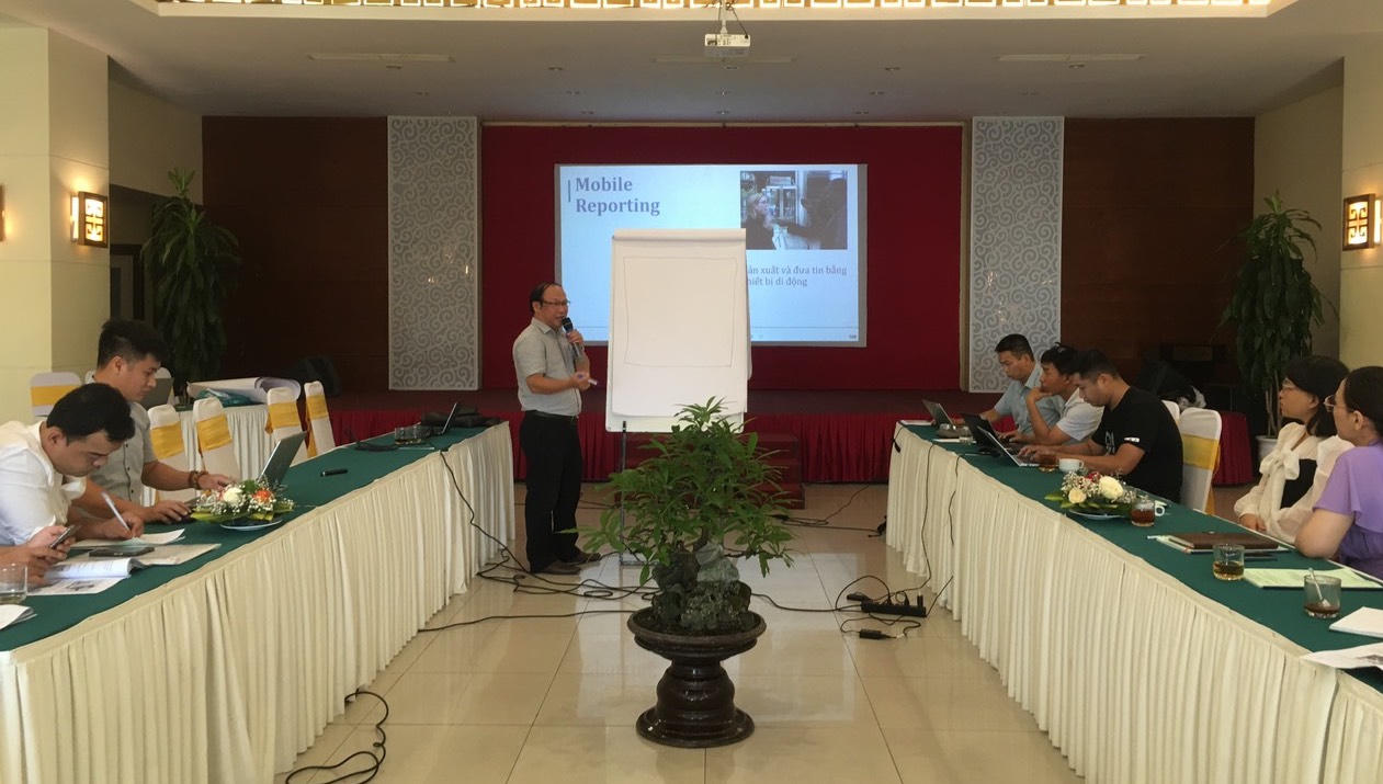 TS. Phan Quốc Hải dạy làm báo bằng điện thoại di động cho học viên. |