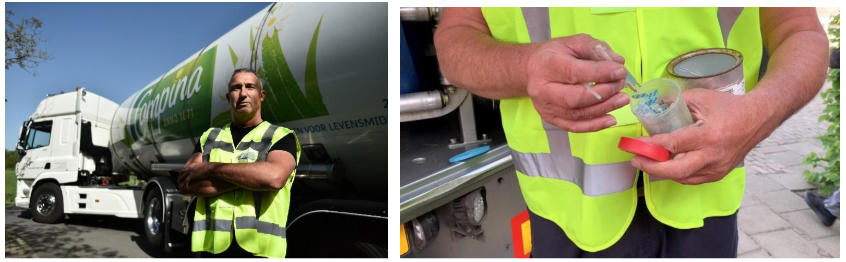Tài xế Rob Walberg đã có 19 năm kinh nghiệm lái xe bồn cho FrieslandCampina. Anh có một bộ dụng cụ riêng để đo kiểm độ pH và các tạp chất cơ bản, đồng thời lấy mẫu đưa về phòng thí nghiệm của nhà máy. Nguồn sữa nguyên liệu này luôn được bảo quản ở 4 độ C trước khi về nhà máy ngay trong ngày.