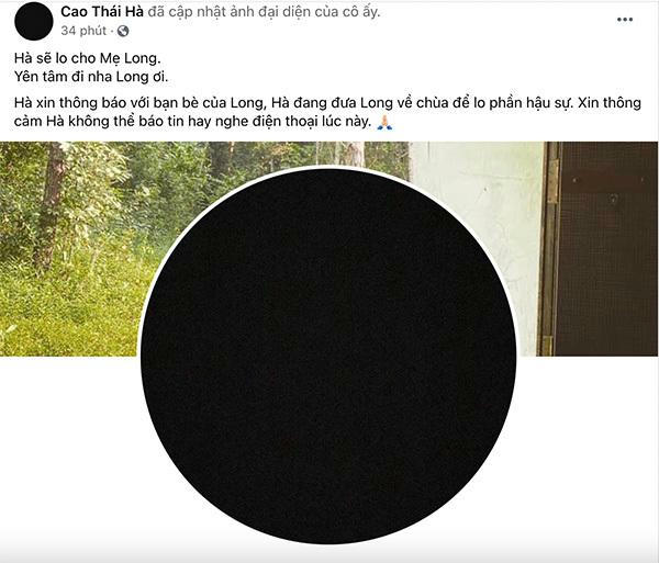 “Hà sẽ lo cho mẹ Long. Yên tâm đi nha Long ơi. Hà xin thông báo với bạn bè của Long, Hà đang đưa Long về chùa để lo phần hậu sự. Xin thông cảm Hà không thể báo tin hay nghe điện thoại lúc này” – Cao Thái Hà viết.