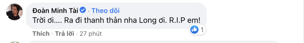 Ngọc Lan thốt lên: “Trời ơi Hà ơi Long ơi”! Diễn viên Hoàng Anh viết: “Nam Mô A Di Đà Phật… xin được gửi lời chia buồn tới em và gia đình Long”. Diễn viên Đoàn Minh Tài cũng bày tỏ nhớ thương trước sự ra đi của Đức Long: “Trời ơi… Ra đi thanh thản nha Long ơi, R.I.P em!”.