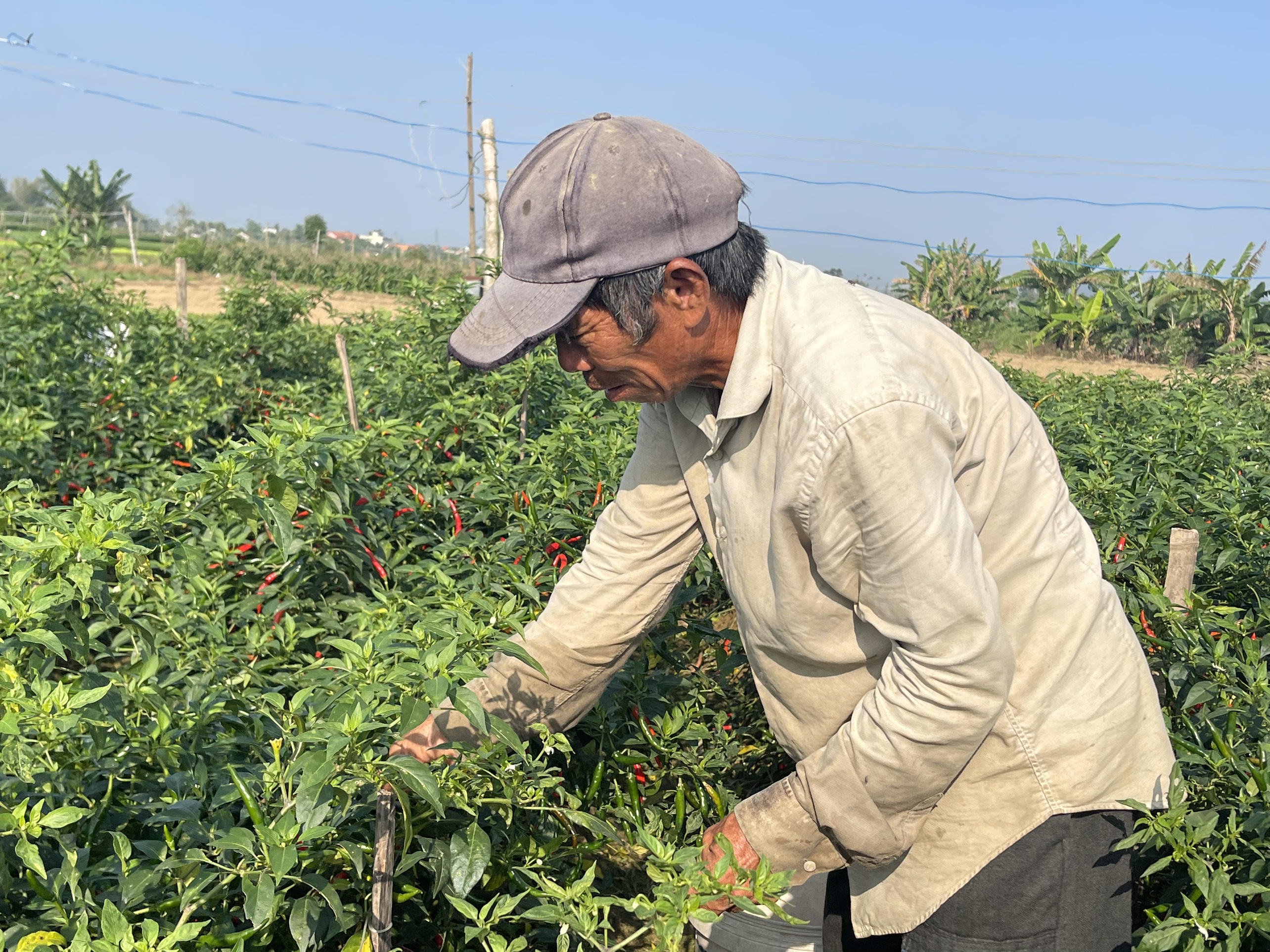 Trồng 1,5 sào ớt, ông Nguyễn Lâm (trú xã Nghĩa Dũng, TP Quảng Ngãi) cho biết: "Tôi vừa bán được khoảng 1 tạ ớt với giá chỉ 9.000 đồng/kg, thu chưa đủ 1 triệu nữa, năm nay cây ớt khiến nông dân rất lo lắng, thấp thỏm".