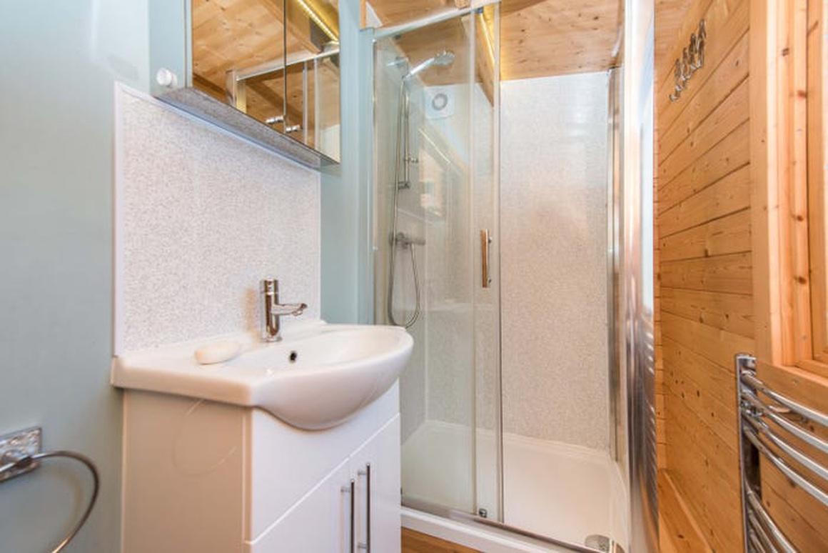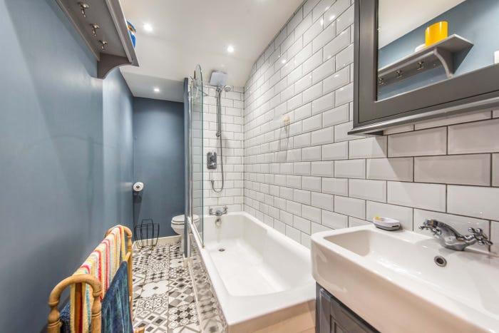 Phòng tắm được bố trí ở tầng 1, nằm giữa phòng khách và nhà bếp, dù chiều rộng rất hẹp, chỉ 1,35 m, nhưng vẫn thoải mái để bố trí vừa vặn một bồn tắm với vòi hoa sen.