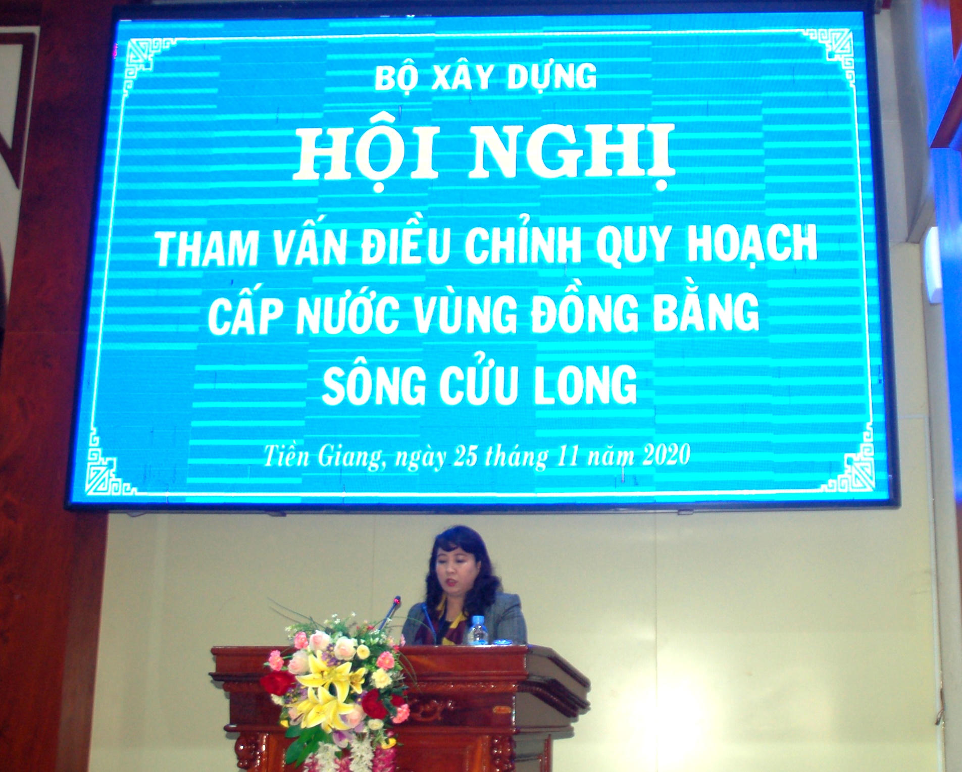 Bà Mai Thị Liên Hương, Cục trưởng Cục Hạ tầng kỹ thuật - Bộ Xây dựng giới thiệu những nội dung trọng tâm về nội dung chính trong Quy hoạch cấp nước vùng ĐBSCL theo Quyết định 2140/QĐ-TTg được Thủ tướng Chính phủ ban bành ngày 08-11-2016 về việc “Phê duyệt cấp nước vùng ĐBSCL đến năm 2030 và tầm nhìn đến năm 2050, nhằm cụ thể hóa nội dung định hướng cấp nước trong Quy hoạch chung xây dựng vùng ĐBSCL đến năm 2030.