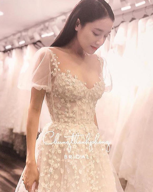 Còn về Nhã Phương, cô đã đặt 3 chiếc váy cưới của nhà thiết kế Chung Thanh Phong. Trong lễ đính hôn vừa qua, nữ diễn viên chọn chiếc váy cưới màu trắng được làm từ vải ren và lưới cùng họa tiết hoa ruby xinh xắn. Trang phục vừa hiện tại vừa cổ điển lại còn tôn lên vóc dáng của Nhã Phương một cách tinh tế.