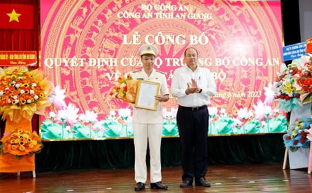 Ông Nguyễn Thanh Bình - Phó Bí thư Tỉnh ủy, Chủ tịch UBND tỉnh An Giang tặng hoa chúc mừng tân Phó Giám đốc Công an tỉnh |