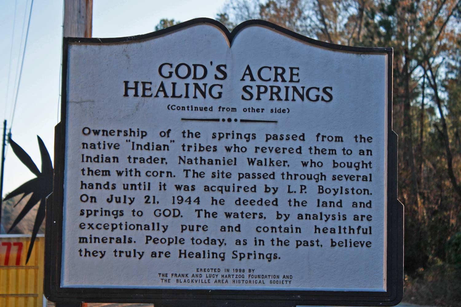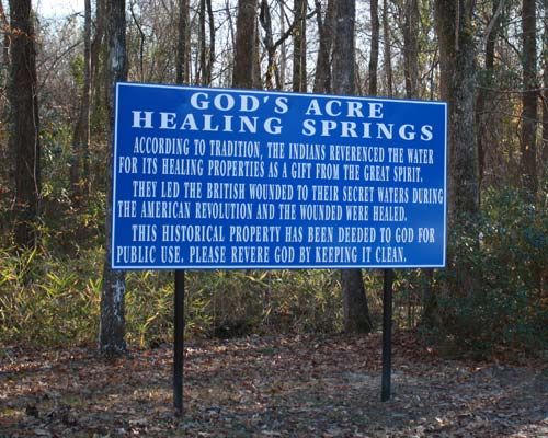 Healing Springs bắt nguồn từ những ngọn núi cao cách hàng trăm dặm về phía Bắc, chảy ngầm xuyên qua các khối đá do đó hoàn toàn không bị ảnh hưởng bởi sự ô nhiễm. Sau khi đến định cư ở đây, người Mỹ bản địa đã đổi Healing Springs lấy ngô với một lái buôn châu Âu. Trải qua nhiều lần mua đi bán lại, năm 1944, người chủ cuối cùng của dòng suối thánh đã quyết định trả nó về cho Chúa để mọi người dân có thể tự do đến lấy nước, tận hưởng phước lành ngài ban tặng.
