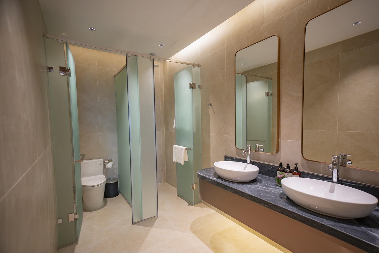Nhà vệ sinh được thiết kế với sự phân chia cụ thể giữa khu tắm và khu bồn cầu riêng biệt, cho phép 3 người sử dụng đồng thời mà vẫn đảm bảo sự riêng tư. |