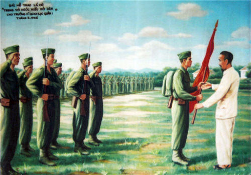 Ở bức ảnh thứ nhất, sau lời phát biểu của Chủ tịch Quân ủy hội Võ Nguyên Giáp và lời tuyên thệ trang nghiêm của các học viên trước quân kỳ, Chủ tịch Hồ Chí Minh đã trao lá cờ thiêng liêng sáu chữ vàng “Trung với nước, hiếu với dân” do Phụ nữ Cứu quốc thành Hoàng Diệu thêu lá cờ cho học viên Bùi Minh Trân - người Sa Đéc.