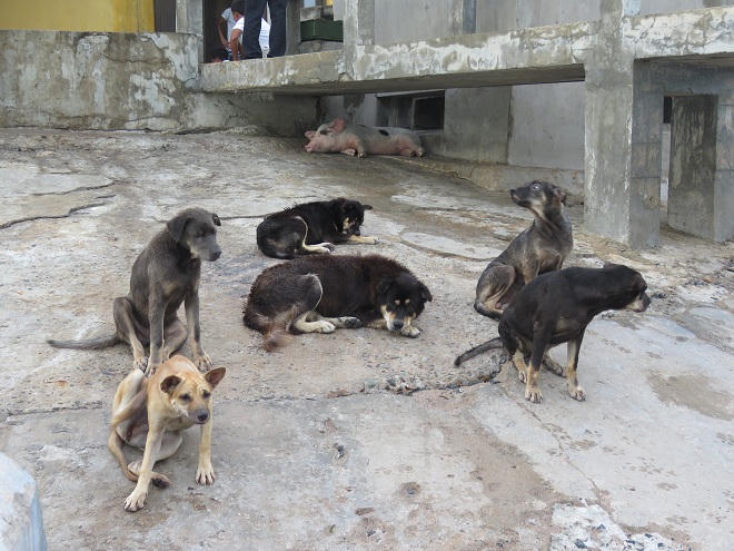 Trên đảo không có cỏ nên bò với lợn đều ăn cơm, ăn cám. Mỗi lần có đoàn ra đảo, các chú bò được cải thiện thêm món... thùng các tông từ số hàng hóa vận chuyển ra. Vậy mà lợn bò trên đảo vẫn múp máp.