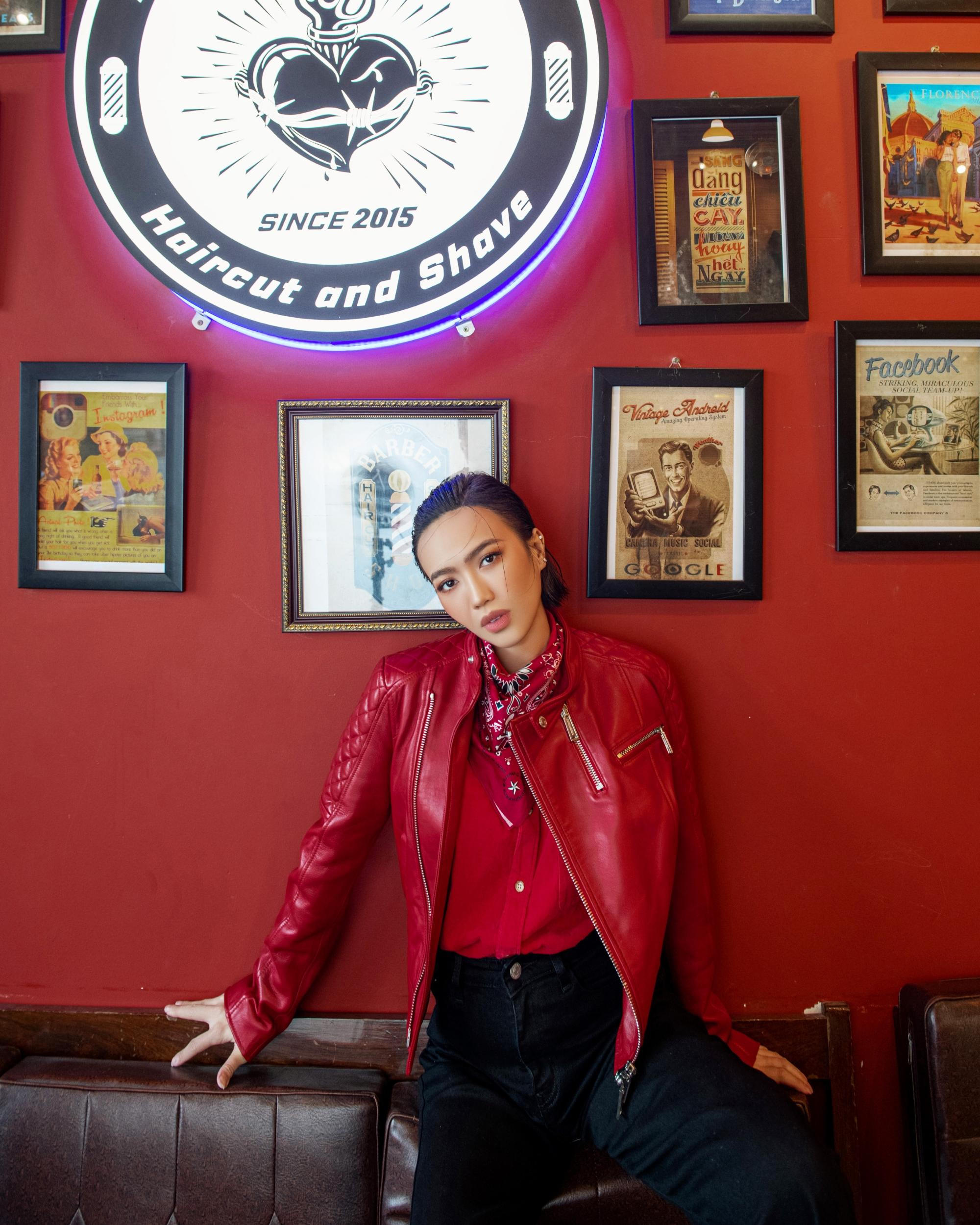 Nét chấm phá hài hoà của cả bộ ảnh khi nhà thiết kế khéo léo mix áo sơmi cổ bèo nhún tông xanh nhạt cùng mũ to bản, đi chệch đường một chút, ngẫu hứng lệch khỏi bảng màu tự nhiên nhưng vẫn rất ổn định. Bộ cánh cuối cùng với tone đỏ rực cùng sự kết hợp đa dạng chất liệu trang phục như tuyên ngôn màu sắc thể hiện sự mạnh mẽ, máu lửa của nữ diễn viên.