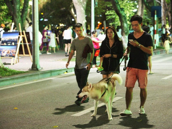 Do chưa có biển báo cấm dẫn súc vật vào phố đi bộ nên nhiều người dắt chó hòa vào dòng người quanh Hồ Gươm, trong đó có rất nhiều trẻ em.