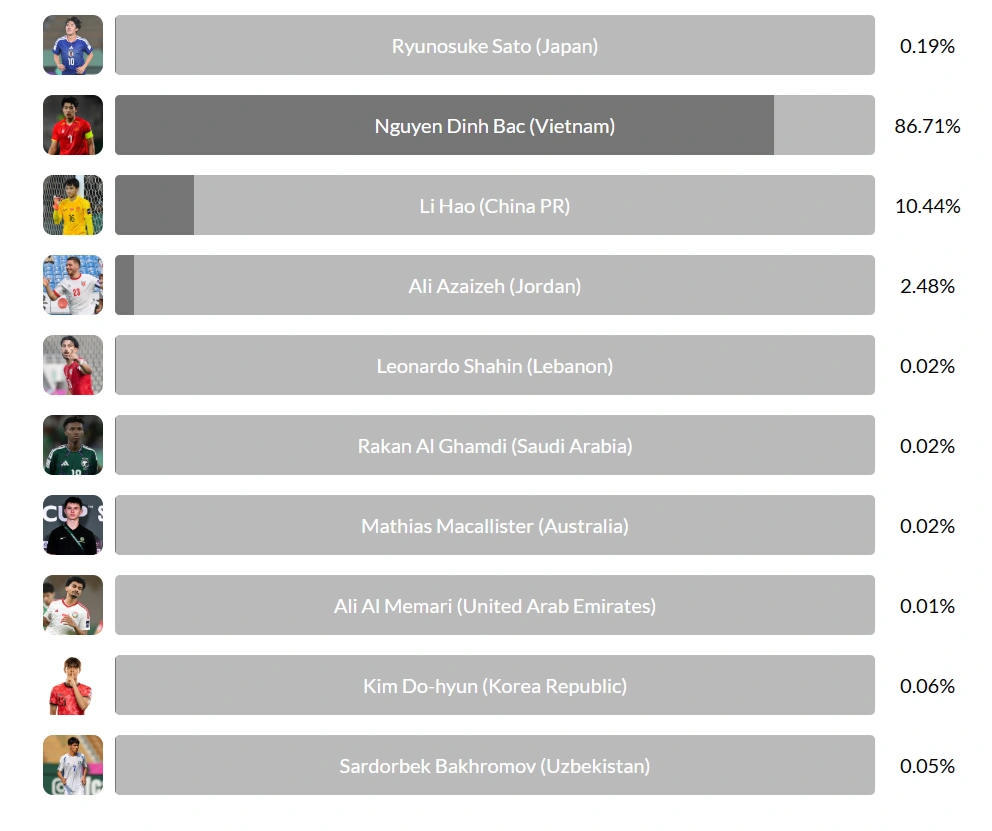 Cuối bài viết, trang chủ giải đấu đặt câu hỏi dành cho độc giả: “Bạn yêu thích cầu thủ nào nhất?”, kèm theo danh sách 10 ứng viên: Đình Bắc (U23 Việt Nam), Li Hao (U23 Trung Quốc), Ali Azaizeh (U23 Jordan), Leonardo Shahin (U23 Lebanon), Rakan Al Ghamdi (U23 Saudi Arabia), Mathias Macallister (U23 Australia), Ali Al Memari (U23 UAE), Kim Do Hyun (U23 Hàn Quốc) và Sardorbek Bakhromov (U23 Uzbekistan).