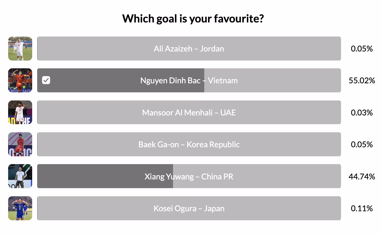Tính đến thời điểm hiện tại, bàn thắng của Đình Bắc hiện đang dẫn đầu với 55,02% lượt bình chọn. Đuổi theo sát nút là bàn thắng của Xiang Yuwang (U23 Trung Quốc) với cú sút chéo góc nâng tỷ số lên 2-0 ở trận bán kết gặp Việt Nam – 44,74%. Trong khi các bàn thắng còn lại nhận được tỷ lệ bình chọn không đáng kể.