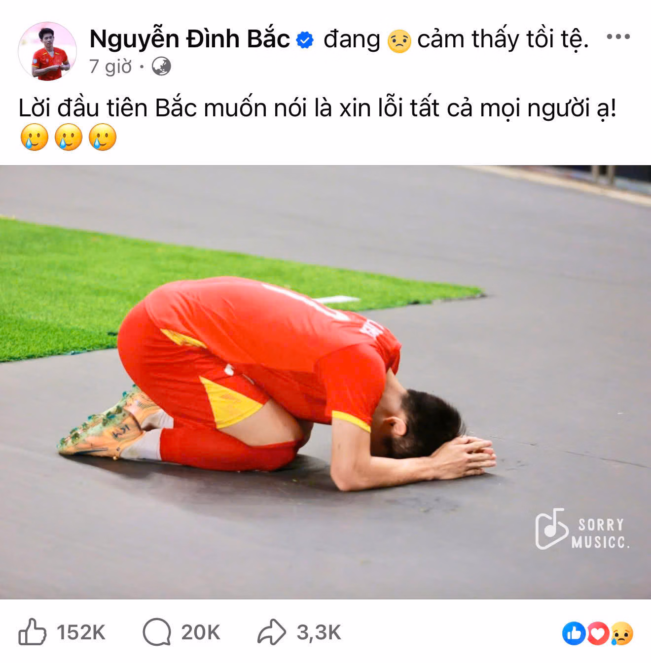 Trong bài đăng trên trang mạng cá nhân, Đình Bắc viết ngắn gọn nhưng đầy cảm xúc: “Lời đầu tiên Bắc muốn nói là xin lỗi tất cả mọi người ạ!”, kèm theo hình ảnh anh ôm đầu, quỳ gối và cúi sát người xuống mặt sân cỏ.