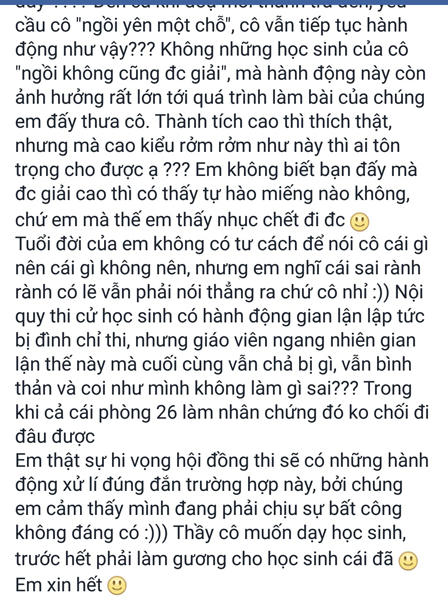 “Nội quy thi cử học sinh có hành động gian lận lập tức bị đình chỉ thi, nhưng giáo viên ngang nhiên gian lận thế này mà cuối cùng vẫn chả bị gì, vẫn bình thản và coi như mình không làm gì sai?... Em thật sự hi vọng hội đồng thi sẽ có những hành động xử lí đúng đắn trường hợp này, bởi chúng em cảm thấy mình đang phải chịu sự bất công không đáng có. Thầy cô muốn dạy học sinh, trước hết phải làm gương cho học sinh cái đã”, thí sinh này viết.