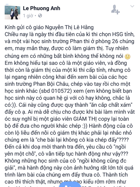 Trước đó, trên trang cá nhân facebook của một người có nick name Le Phuong Anh có đăng tải bài viết với nội dung bất bình về hành động không đúng chuẩn mực của giám thị N.T.H.L trong lúc coi thi, người này cho rằng đó là “ăn cắp chất xám”.