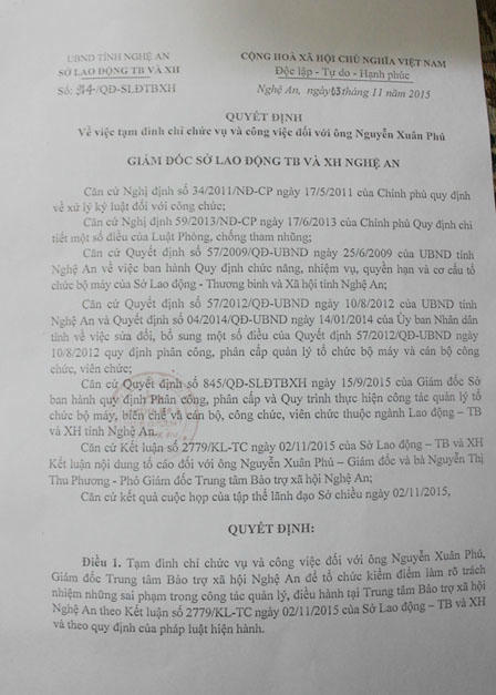 Thông tin từ Sở LĐTB&XH tỉnh Nghệ An cho biết: Ngày 3/1/2015, Sở LĐTB&XH tỉnh Nghệ An đã có Quyết định tạm đình chỉ chức vụ và công việc đối với ông Phạm Xuân Phú - Giám đốc và bà Nguyễn Thị Thu Phương - Phó Giám đốc Trung tâm bảo trợ xã hội tỉnh Nghệ An.