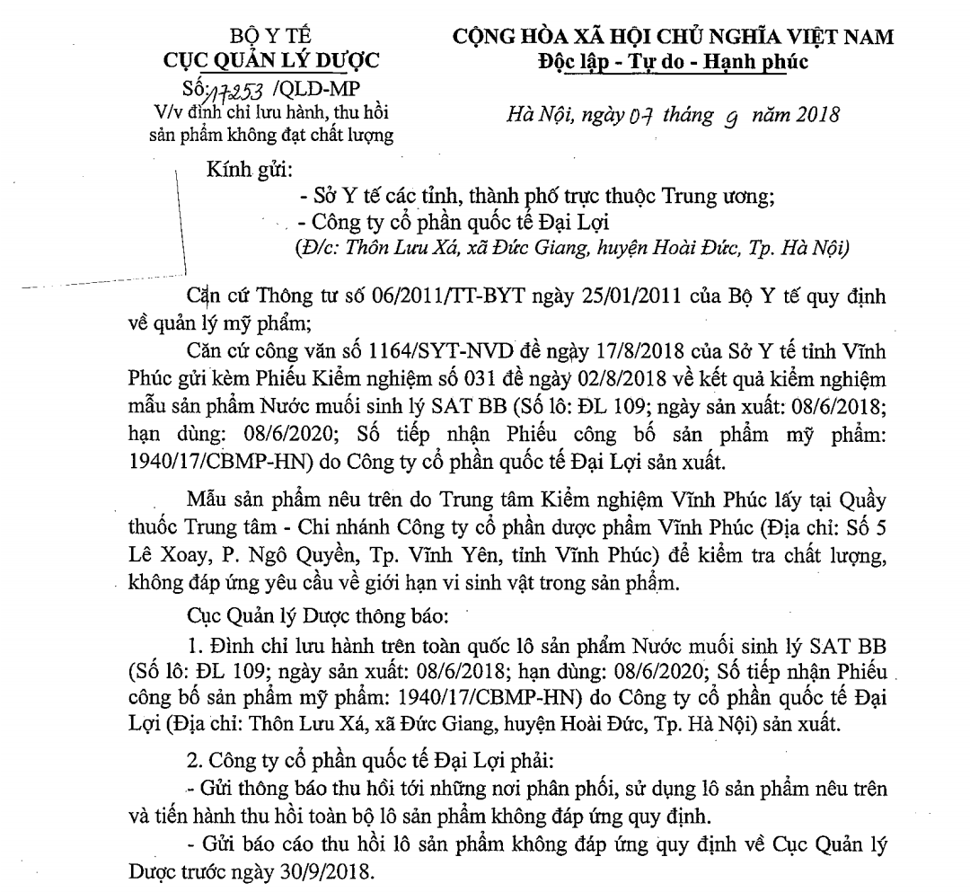 Cục Quản lý Dược thông báo đình chỉ lưu hành trên toàn quốc lô sản phẩm Nước muối sinh lý SAT BB, số lô: ĐL 109; ngày sản xuất: 08/6/2018; hạn dùng: 08/6/2020; Số tiếp nhận Phiếu công bố sản phẩm mỹ phẩm: 1940/17/CBMP-HN) do Công ty cổ phần quốc tế Đại Lợi (đại chỉ: thôn Lưu Xá, xã Đức Giang, huyện Hoài Đức, thành phố Hà Nội) sản xuất.