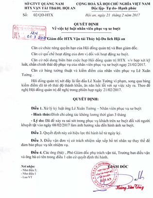 Ông Lê Xuân Tường, nhân viên phục vụ xe buýt nhận hình thức kỷ luật đình chỉ công tác không lương trong thời gian 3 tháng.Vì để xảy ra sai sót trong phục vụ xe buýt đối với người khuyết tật, làm ảnh hưởng xấu đến hình ảnh xe buýt.