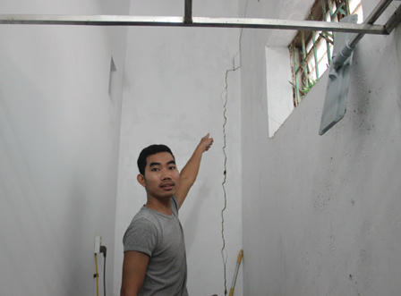 Nhà anh Nguyễn Văn Lộc mới xây được hơn một năm cũng không dám ở. Phần móng nhà bị kéo nứt toác, có chỗ rộng hơn 2cm. Tường nhà tắm cũng bị xé thành hai phần khác nhau… Xung quanh lối vào các nhà hộ dân phải dựng cọc và che lưới để tránh đất đá và các vật rơi xuống gây nguy hiểm đến tính mạng..