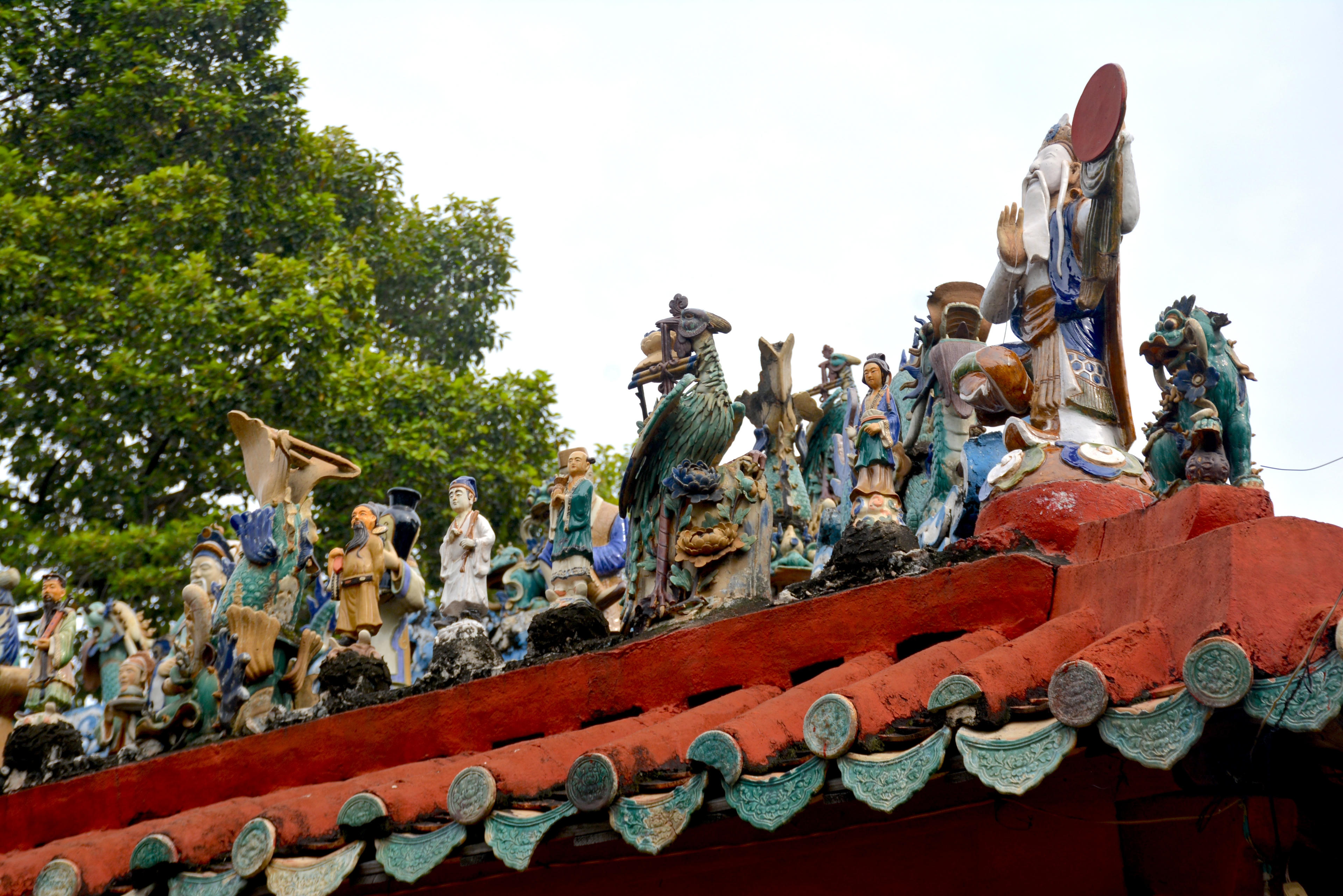 Đặc biệt ở di tích là sự thể hiện một công trình nghệ thuật độc đáo trên mặt tiền của mái đình. Đó là một tập hợp tranh tượng gốm do những nghệ nhân gốm Biên Hòa tạo dựng, phối cảnh tạo nên một công trình nghệ thuật đích thực. Những tranh tượng gốm tùy cụm, nhân vật, thú với những sắc thái riêng, lột tả những nội dung cần biểu tả. Những sự tích về "Bát Tiên quá hải", "Quan Công phò nhị tẩu", những tích thời Chiến quốc, các đề tài dân gian "Lý ngư hóa long", "Lưỡng long tranh châu", nhật nguyệt, long phụng... vẫn sống động với thời gian.