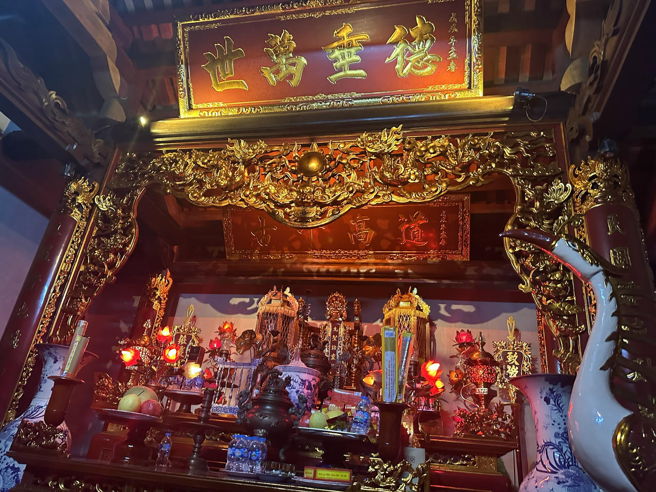 Theo quan sát, phía trên cung chính, nơi thờ tam vị Thành hoàng, có hai bức hoành phi đề chữ “Thượng đẳng tối linh” và “Long Đỗ trung anh” ca ngợi sự linh thiêng của các vị Thành hoàng. Phía dưới là những câu đối kể lại công lao của các vị trong việc giúp vua Lý Thái Tổ xây dựng thành Thăng Long, đánh tan bùa đồng của Cao Biền cũng như diệt trừ yêu ma, giặc dã để người dân có cuộc sống bình yên.