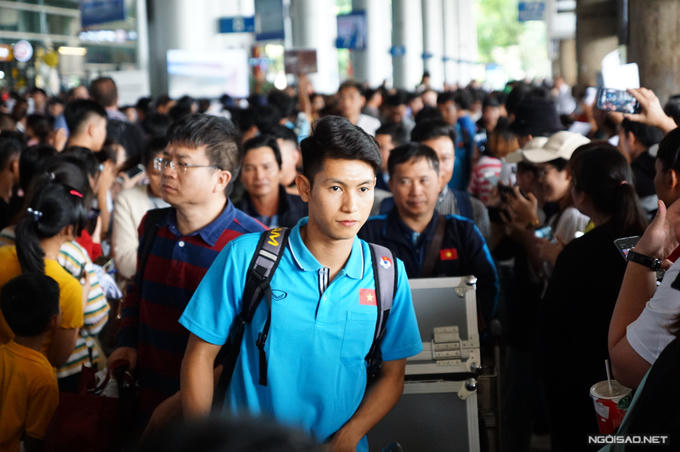 Đình Trọng và các cầu thủ U23 Việt Nam bị người hâm mộ vây kín ở sân bay Tân Sơn Nhất chiều 22/12, sau khi kết thúc chuyến tập huấn ở Hàn Quốc.