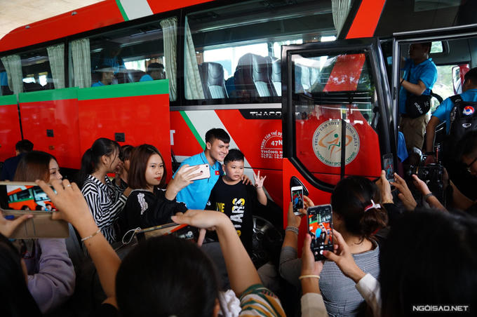 Quang Hải ở gần đó cũng chịu cảnh tương tự. Một fan tính giơ tay chạm mặt Quang Hải nhưng tiền vệ sinh năm 1997 phản xạ nhanh, né qua một bên.