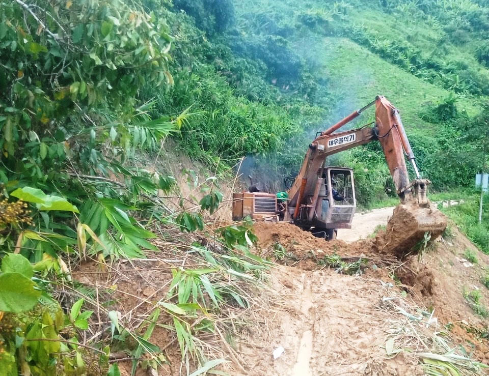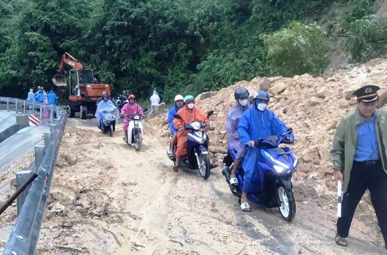 Tỉnh lộ 611 qua đèo Le bị sạt lở tối 13/10 và mới được thông xe bước 1 sáng 14/10. |