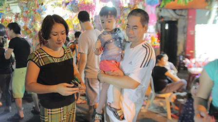 Anh Vũ Quyết Thắng (Lĩnh Nam, Hà Nội) cùng cậu con trai của mình chỉ ngắm qua những món đồ chơi dân gian. “Cũng thích mua cho con một món đồ chơi truyền thống như đèn ông sao, đèn cá chép... Nhưng có quá nhiều đồ chơi mới bắt mắt hơn nên thằng bé không để ý đến những món đồ dân gian đơn giản kia, trẻ con mà”, anh cười chia sẻ.