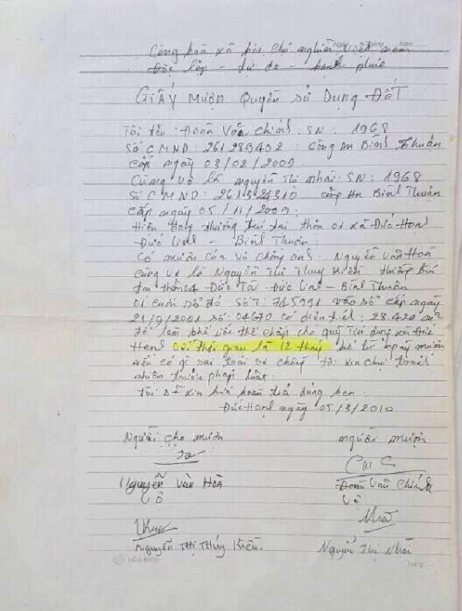 Trong 1 số hợp đồng tín dụng vay tiền của ông Chính, phần xác định giá trị tài sản đảm bảo đều có chữ ký của ông Hòa. Và trong một tờ giấy ủy quyền cho mượn giấy chứng nhận sử dụng đất (không có thời hạn cho mượn) có xác nhận của chính quyền địa phương cũng có chữ ký của ông Hòa.