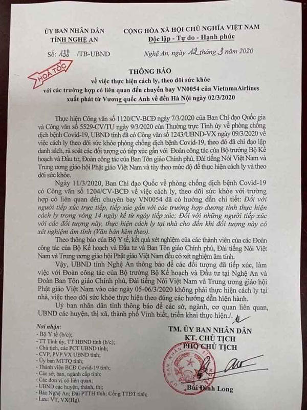 Sáng 12/3, ông Bùi Đình Long, Phó chủ tịch UBND tỉnh Nghệ An ký thông báo hỏa tốc gửi Bộ Y tế, thường trực Tỉnh ủy, các sở ban, ngành liên quan về việc thực hiện cách ly, theo dõi sức khỏe với các trường hợp có liên quan đến chuyến bay VN0054 từ Vương quốc Anh về Hà Nội ngày 2/3.