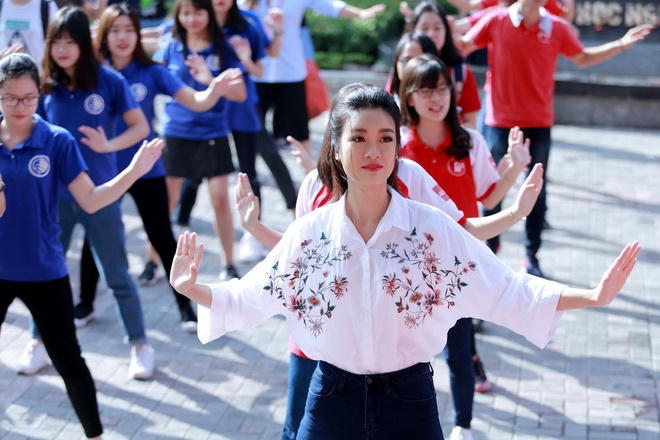 Trong trang phục áo sơ mi, quần jean, người đẹp thu hút các ánh nhìn với nụ cười rạng rỡ và vẻ thân thiện, hoà đồng. Sau khi nhảy flashmob cùng các bạn sinh viên, Mỹ Linh trao hoa và nói lời cảm ơn các thầy cô.