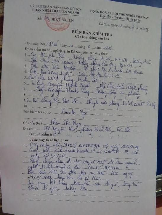 Tuy nhiên thực tế buổi kiểm tra của Đoàn kiểm tra liên ngành cho thấy, 2 cơ sở kinh doanh karaoke này mặc dù chưa đủ điều kiện được cấp phép kinh doanh nhưng vẫn cứ được Sở VHTT&DL Hải Phòng cấp phép hoạt động kinh doanh karaoke, UBND quận Đồ Sơn cấp giấy phép hoạt động kinh doanh... CA quận Đồ Sơn chứng nhận đủ điều kiện đảm bảo ANTT và cuối cùng là biên bản kiểm tra đủ điều kiện về mặt PCCC do Phòng Cảnh sát PCCC số 5 cấp./.