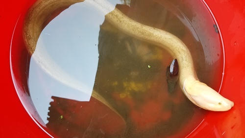 Hiện con lươn vẫn sống khỏe mạnh, được anh Hòa nuôi trong thau nhựa, hàng ngày anh bắt giun đất cho lươn ăn.