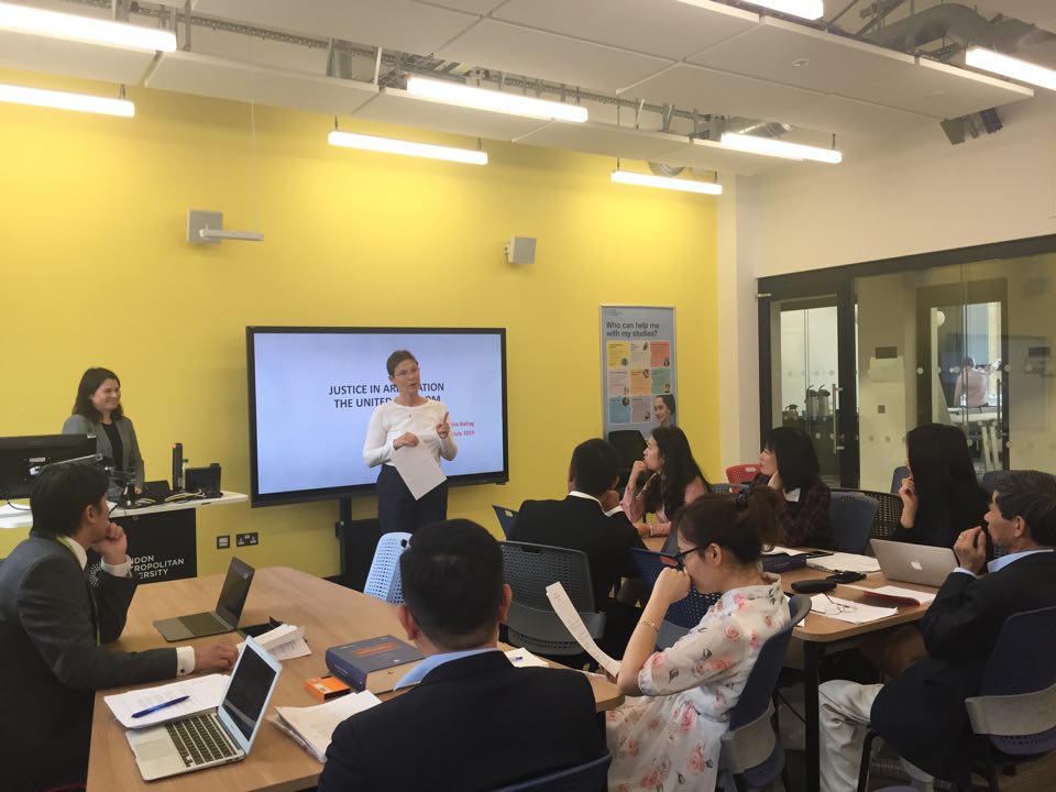 (PLVN) - Ngày 15/7, đoàn cán bộ của Bộ Tư pháp Việt Nam do bà Ngô Quỳnh Hoa, Phó Vụ trưởng Vụ Phổ biến giáo dục pháp luật Bộ Tư pháp làm Trưởng đoàn bắt đầu chuyến học tập, nghiên cứu chuyên sâu về bổ trợ tư pháp và trọng tài thương mại quốc tế tại Đại học Metropolitan, Vương quốc Anh trong thời gian từ 13 - 22/7.