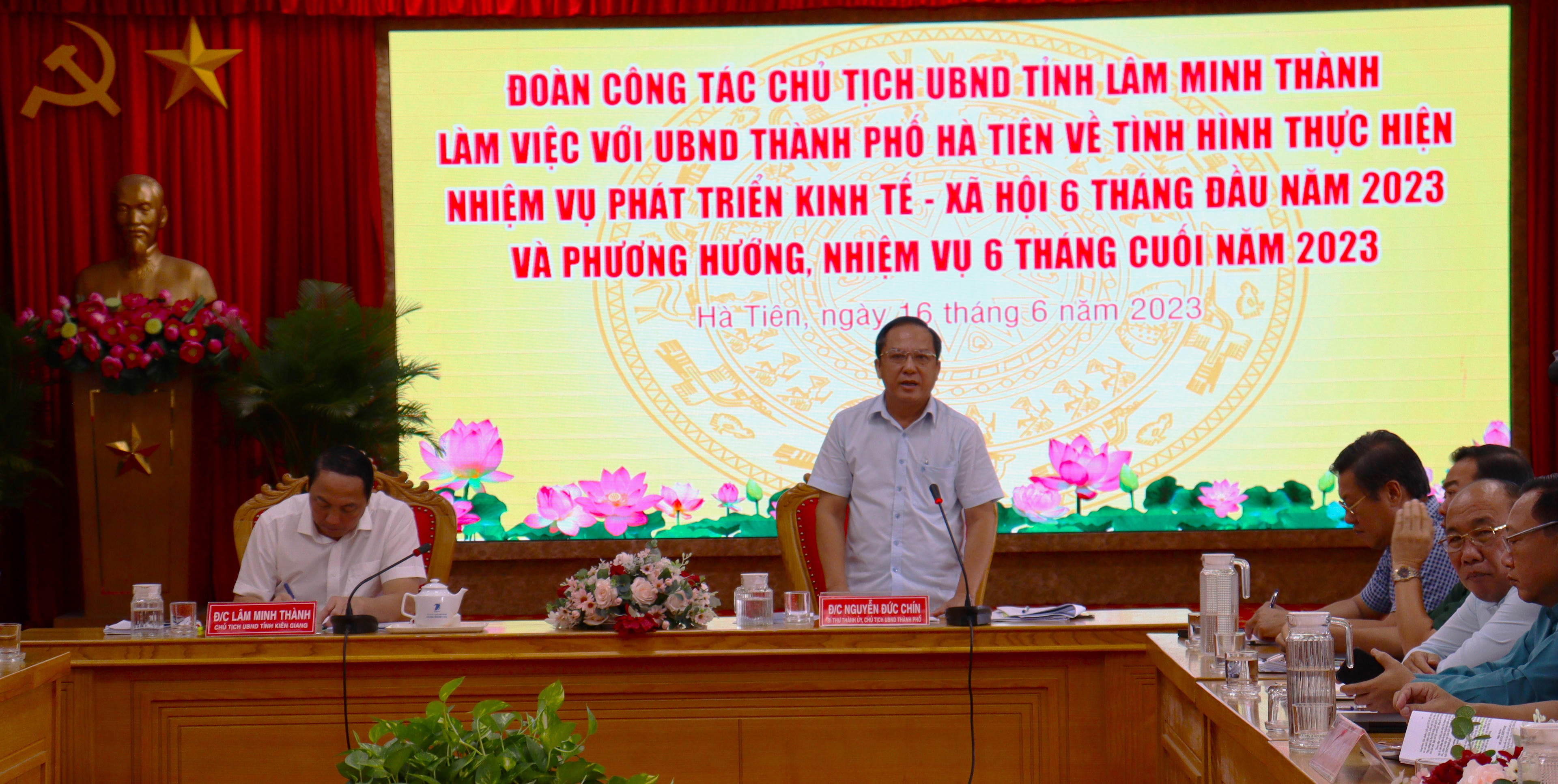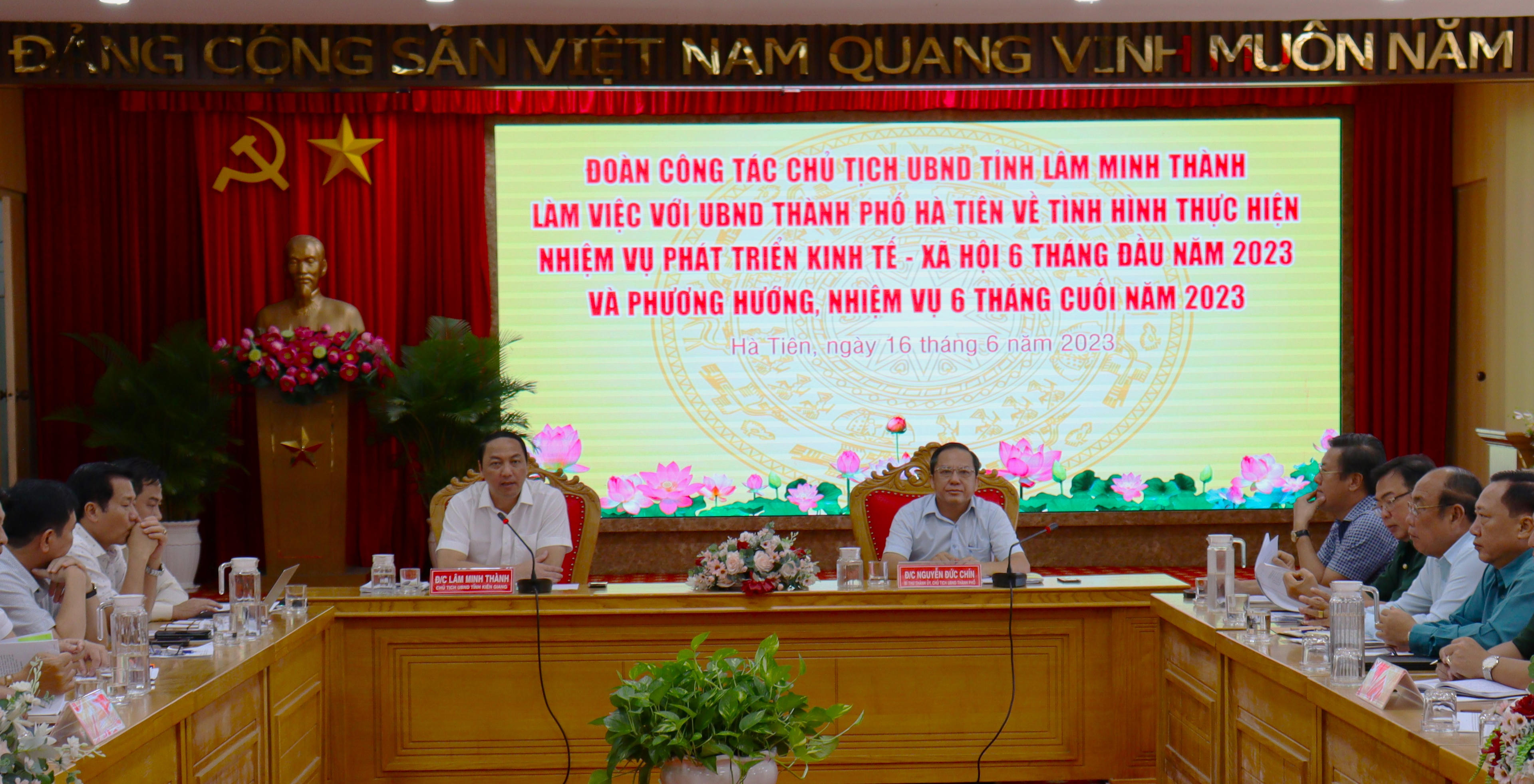(PLVN) - Đoàn công tác của Lãnh đạo tỉnh Kiên Giang do ông Lâm Minh Thành - Phó Bí thư Tỉnh ủy, Chủ tịch UBND tỉnh làm Trưởng đoàn, mới đến làm việc tại TP Hà Tiên về tình hình thực hiện nhiệm vụ phát triển kinh tế - xã hội 6 tháng đầu năm 2023 và phương hướng nhiệm vụ 6 tháng cuối năm 2023.