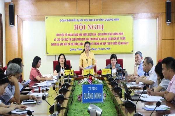 Sáng cùng ngày, Đoàn Đại biểu Quốc hội tỉnh cũng đã có buổi làm việc với Ngân hàng Nhà nước Việt Nam chi nhánh tỉnh Quảng Ninh và các tổ chức tín dụng trên địa bàn tỉnh để nghe báo cáo, kiến nghị và ý kiến tham gia vào một số dự thảo luật. Tại buổi làm việc, đại diện các ngân hàng đã trao đổi, kiến nghị tập trung vào một số nội dung: Chế tài xử lý đối với các khoản nợ xấu; kiểm soát thông tin đối với khách hàng và một số giải pháp nhằm tháo gỡ những vấn đề khó khăn, vướng mắc đối với hoạt động ngân hàng; vướng mắc trong pháp lý của lĩnh vực bất động sản.