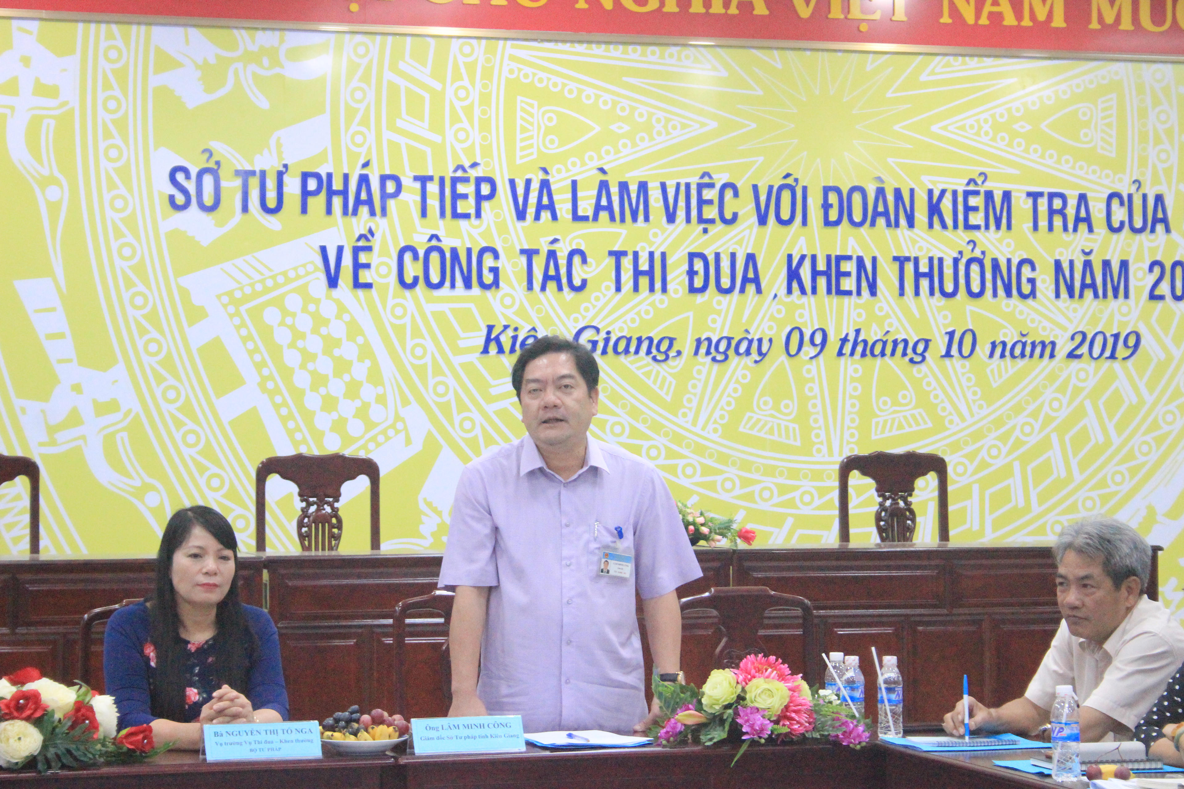(PLVN) - Thực hiện Quyết định số 2178/QĐ-BTP ngày 15/8/2019 của Bộ Tư pháp về việc ban hành Kế hoạch kiểm tra công tác thi đua, khen thưởng năm 2019, chiều ngày 09/10, Đoàn kiểm tra của Bộ Tư pháp do bà Nguyễn Thị Tố Nga - Vụ trưởng Vụ Thi đua - Khen thưởng, Phó Chủ tịch Thường trực Hội đồng Thi đua, Khen thưởng ngành Tư pháp làm trưởng đoàn đã có buổi làm việc với Sở Tư pháp tỉnh Kiên Giang về công tác thi đua, khen thưởng của ngành trong năm 2019. Đồng chủ trì buổi làm việc có ông Lâm Minh Công - Giám đốc Sở Tư pháp tỉnh Kiên Giang.