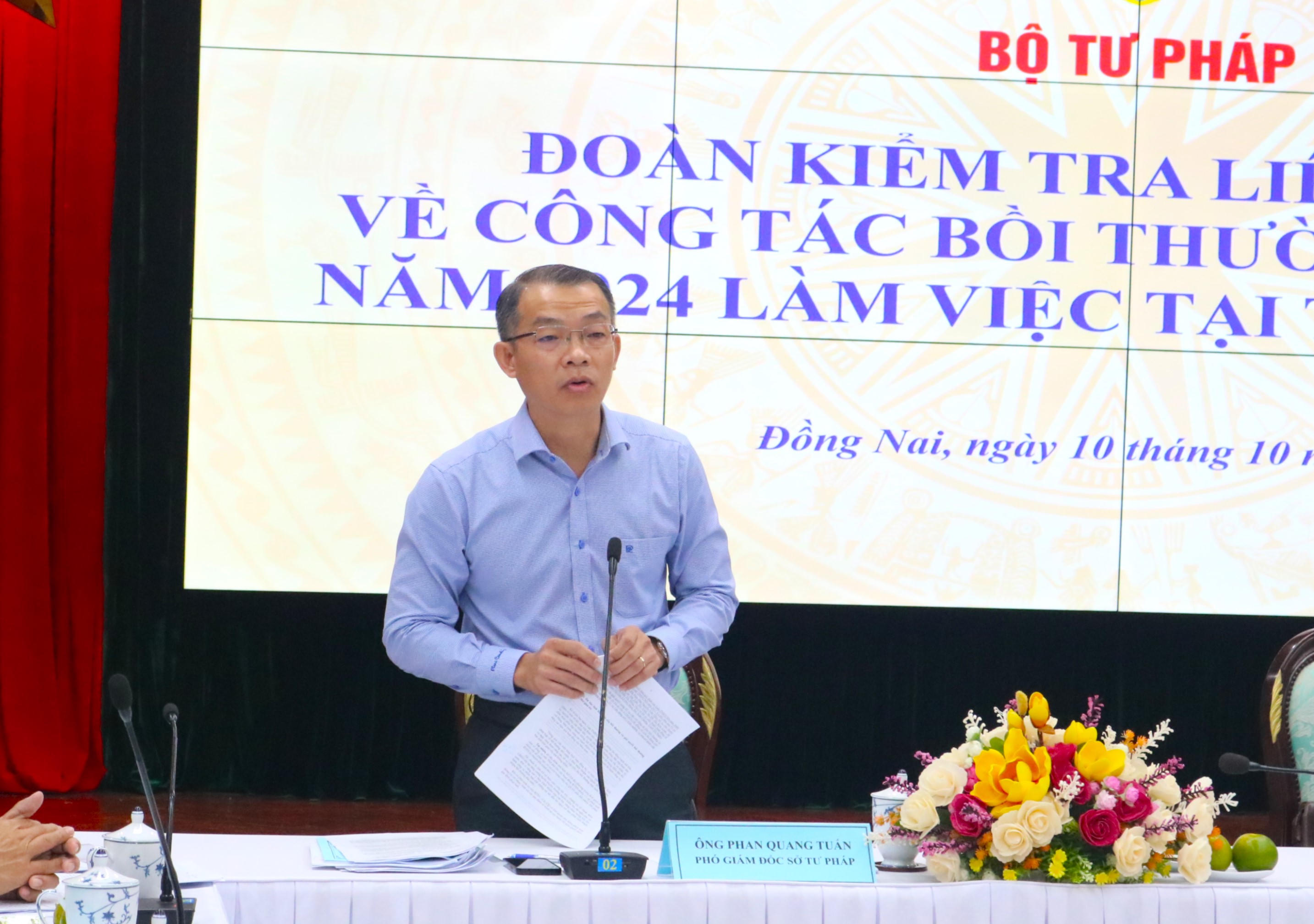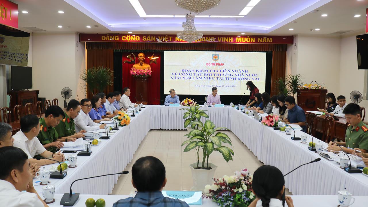 (PLVN) - Sáng 10/10, Đoàn kiểm tra liên ngành của Bộ Tư pháp do ông Trần Việt Hưng – Phó Cục trưởng phụ trách Cục Bồi thường nhà nước ( Bộ Tư pháp ) làm trưởng đoàn đã có buổi làm việc với UBND tỉnh Đồng Nai về công tác bồi thường nhà nước năm 2024. Tiếp và làm việc với đoàn có ông Phan Quang Tuấn – Phó Giám đốc sở Tư pháp và lãnh đạo sở, ban, ngành liên quan của tỉnh Đồng Nai .