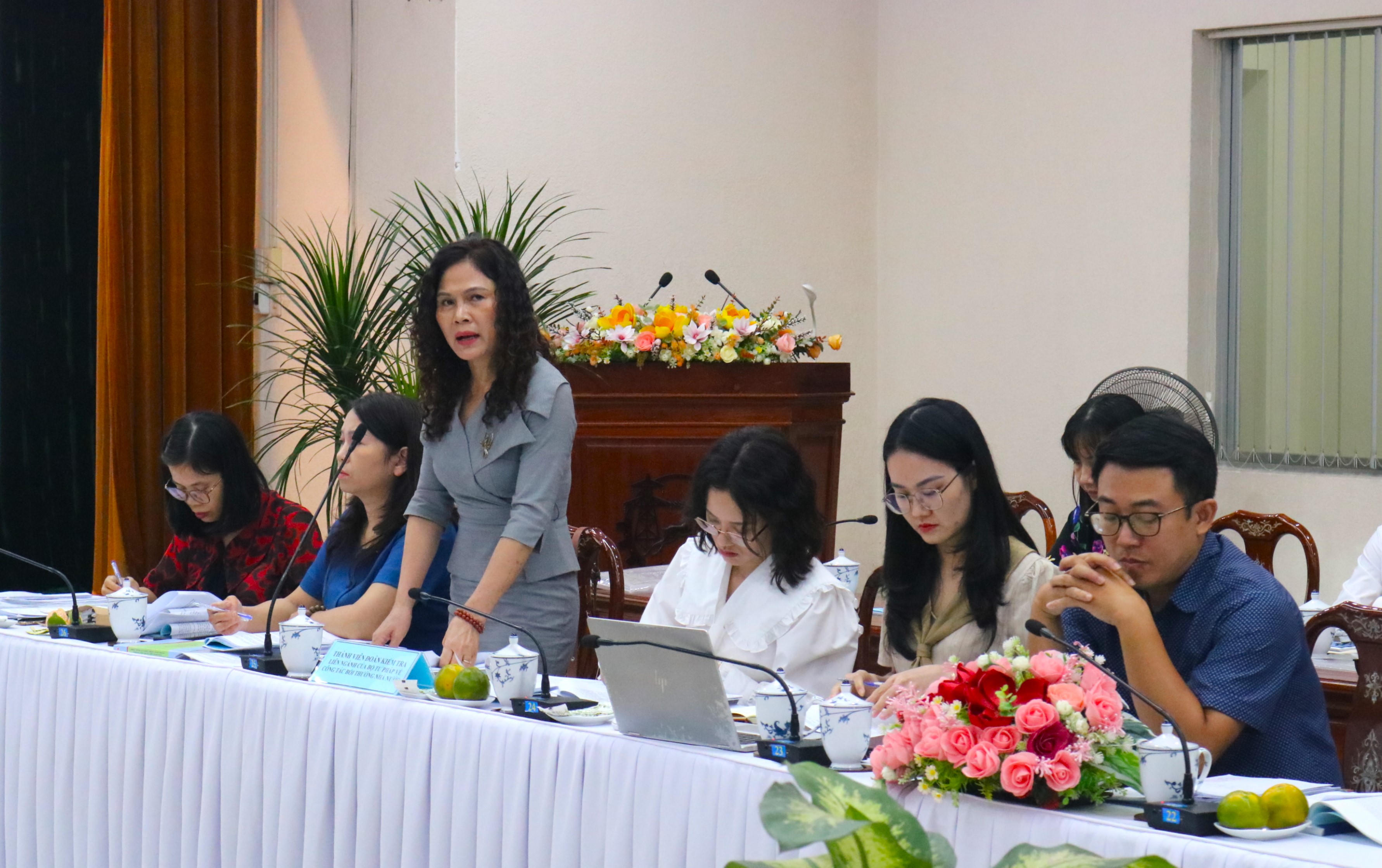 Thành viên Đoàn kiểm tra liên ngành của Bộ Tư pháp trao đổi về các vấn đề chuyên môn. |