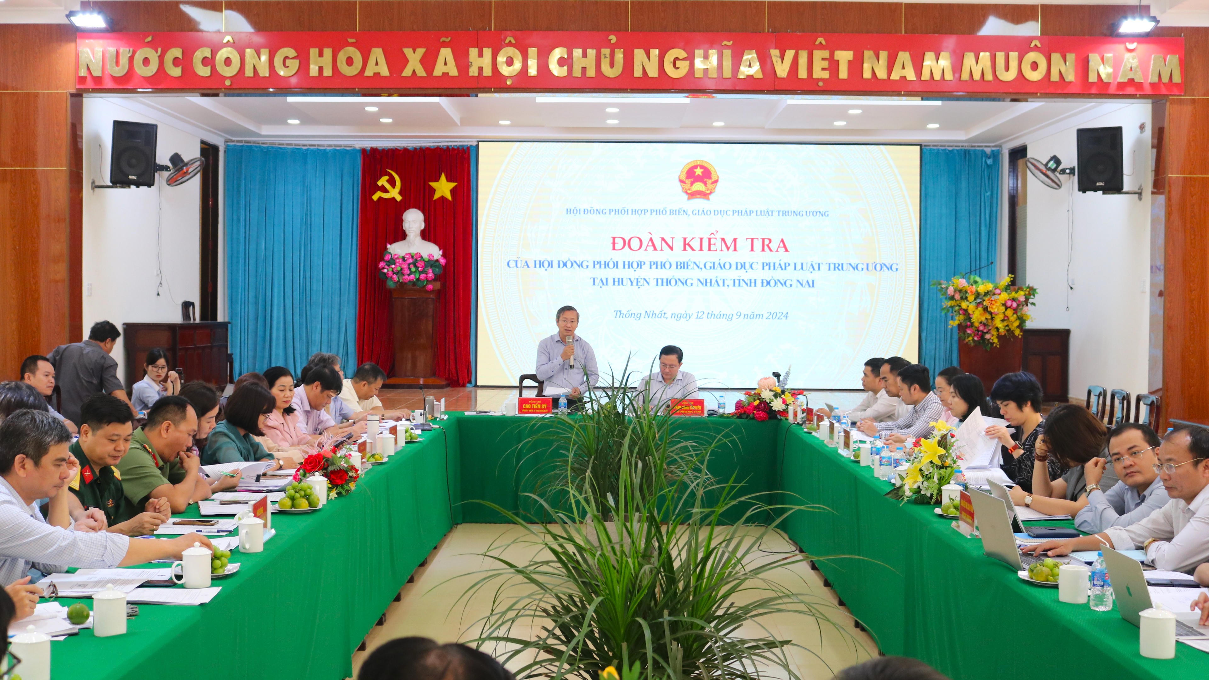 (PLVN) - Sáng 12/9/2024, Đoàn kiểm tra của Hội đồng phối hợp PBGDPL Trung ương do ông Phan Hồng Nguyên – Phó Cục trưởng Cục PBGDPL, Bộ Tư pháp, làm trưởng đoàn đã có buổi kiểm tra tại huyện Thống Nhất, tỉnh Đồng Nai. Cùng đi có đại diện Bộ Giáo dục và Đào tạo, Bộ Kế hoạch và Đầu tư, Bộ Tài chính, Bộ Tài nguyên và Môi trường, Ngân hàng Nhà nước Việt Nam, Liên đoàn Luật sư Việt Nam, Liên đoàn Thương mại và Công nghiệp Việt Nam…