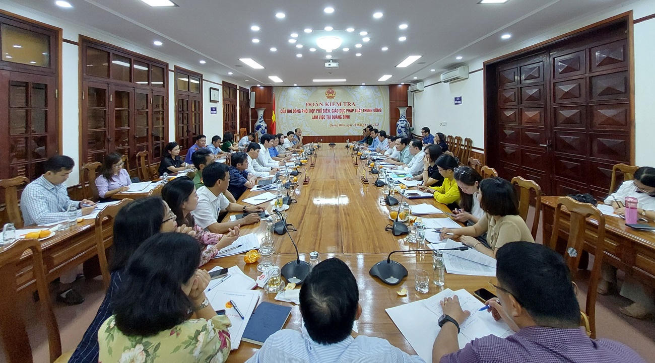 Báo cáo tại buổi làm việc, ông Trần Chí Tiến, Giám đốc Sở Tư pháp, Phó Chủ tịch Thường trực Hội đồng phối hợp PBGDPL tỉnh cho biết; năm 2022 và 6 tháng đầu năm 2023, toàn tỉnh đã tổ chức 15.488 hội nghị, cuộc họp cho trên 1.711.000 lượt người; tổ chức 203 cuộc thi với 167.609 lượt người tham gia; in ấn, phát hành 408.727 tài liệu, trong đó có 22.663 tài liệu đăng tải trên Internet. Tổ chức 27 hội nghị, lớp tập huấn, bồi dưỡng kiến thức pháp luật cho báo cáo viên pháp luật cấp tỉnh, hòa giải viên ở cơ sở; thực hiện 36 chuyên mục “Pháp luật và Đời sống” trên Báo Quảng Bình và Đài phát thanh Truyền hình Quảng Bình; in ấn và cấp phát hơn 53.400 tài liệu tuyên truyền cùng nhiều lượt tin, bài trên các Trang thông tin điện tử, nhằm tạo kênh thông tin tuyên truyền, phổ biến giáo dục pháp luật được nhanh chóng kịp thời…