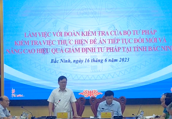 Phó Giám đốc Sở Tư pháp tỉnh Bắc Ninh Đoàn Thị Hồng Nhung đã báo cáo đoàn công tác kết quả thực hiện đề án 250 về tiếp tục đổi mới và nâng cao hiệu quả giám định Tư Pháp từ ngày 28/02/2018 (ngày Đề án có hiệu lực thi hành) đến ngày 30/4/2023. Nội dung gồm kết quả thực hiện nhiệm vụ, quyền hạn của UBND tỉnh về giám định tư pháp; Tình hình tổ chức, hoạt động và quản lý giám định Tư pháp; Trưng cầu giám định, đánh giá, sử dụng kết luận giám định; Những hạn chế, khó khăn, vướng mắc trong quá trình trưng cầu giám định cùng một số nội dung khác liên quan đến việc thực hiện Đề án 250 và pháp luật về giám định Tư pháp.