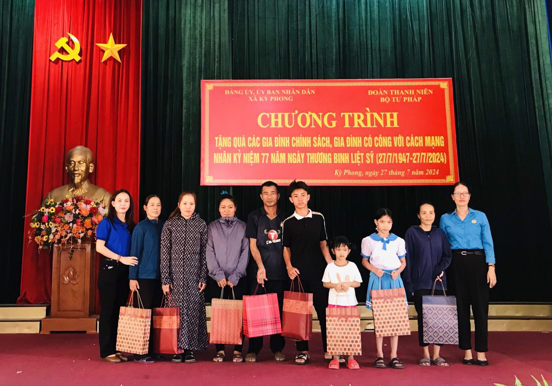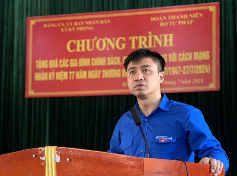 Ông Trịnh Xuân Tùng - Uỷ viên BCH Đoàn Khối các cơ quan Trung ương, Bí thư Đoàn Bộ Tư pháp cho biết: Đoàn thanh niên Bộ phối hợp với Đảng ủy, UBND xã Kỳ Phong, huyện Kỳ Anh đã trao tặng 50 suất quà tặng thương binh, gia đình chính sách, học sinh có hoàn cảnh khó khăn tại xã Kỳ Phong.