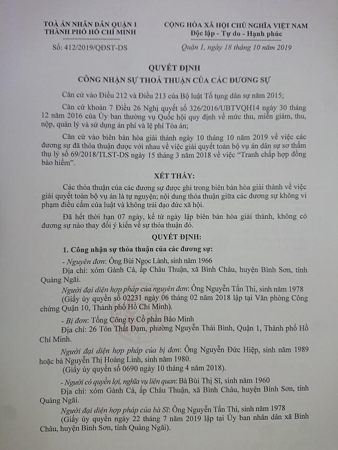 Việc hòa giải thành vào ngày 10/10. Đến ngày, 18/10, sau bảy ngày hai bên không có sự thay đổi ý kiến, nên TAND quận 1, TP HCM ra quyết định công nhận sự thỏa thuận của các đương sự. Quyết định có hiệu lực ngay lập tức. Bảo Minh phải thanh toán cho ngư dân Lành số tiền 500 triệu một lần trong vòng 20 ngày. Nếu chậm trễ phải chịu lãi suất theo quy định. Bảo Minh phải chịu án phí 12 triệu đồng, ông Lành không phải đóng án phí.