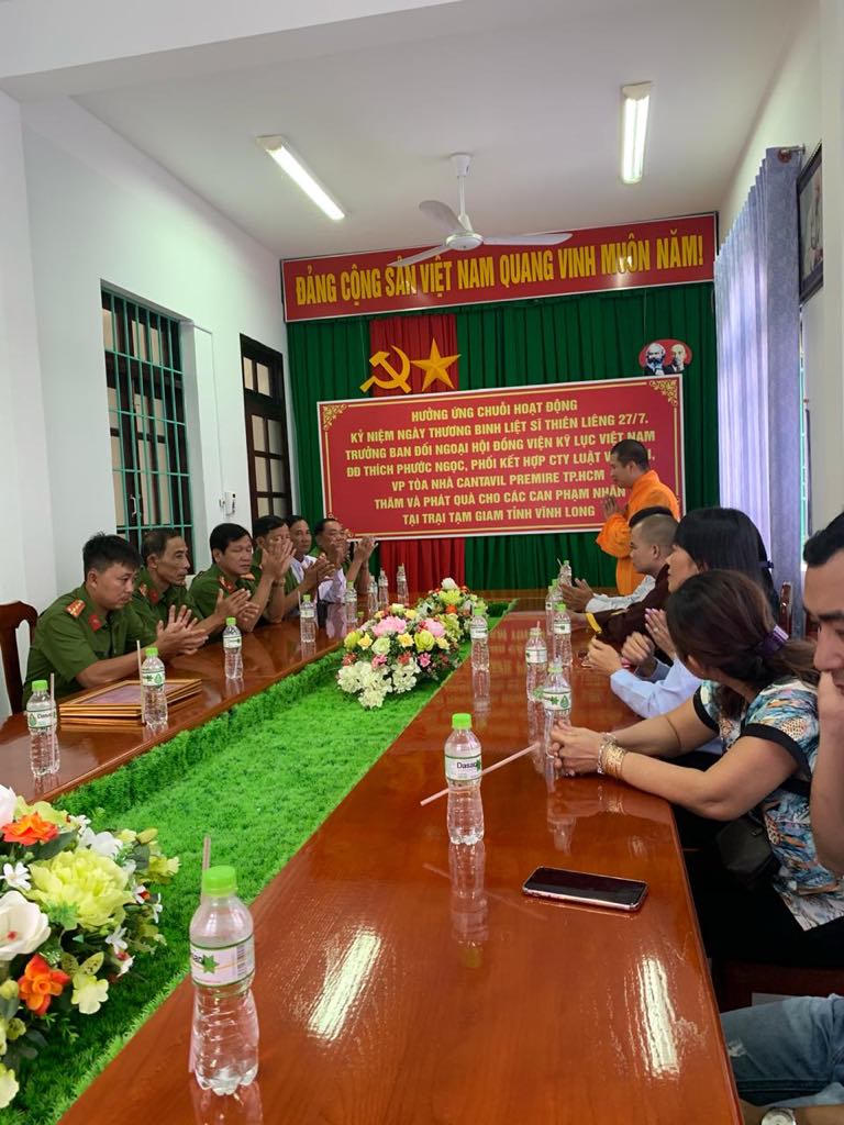 Thay mặt Ban Giám Đốc Công An Vĩnh Long, Thượng tá Nguyễn Văn Sum - giám thị trại đã trân trọng chào mừng đoàn, ghi nhận sự quan tâm chia sẻ của Bà Nguyễn Thị Huyền Trang, Giám đốc Công ty luật Viên An và Đại đức Thích Phước Ngọc, những người trong nhiều năm qua đã bền bỉ tham gia đóng góp giúp đơn vị chăm lo cải thiện hơn điều kiện sinh hoạt, giúp những người đang bị tam giam có tinh thần và ý chí tốt hơn, sớm được hoà nhập lại cộng đồng.