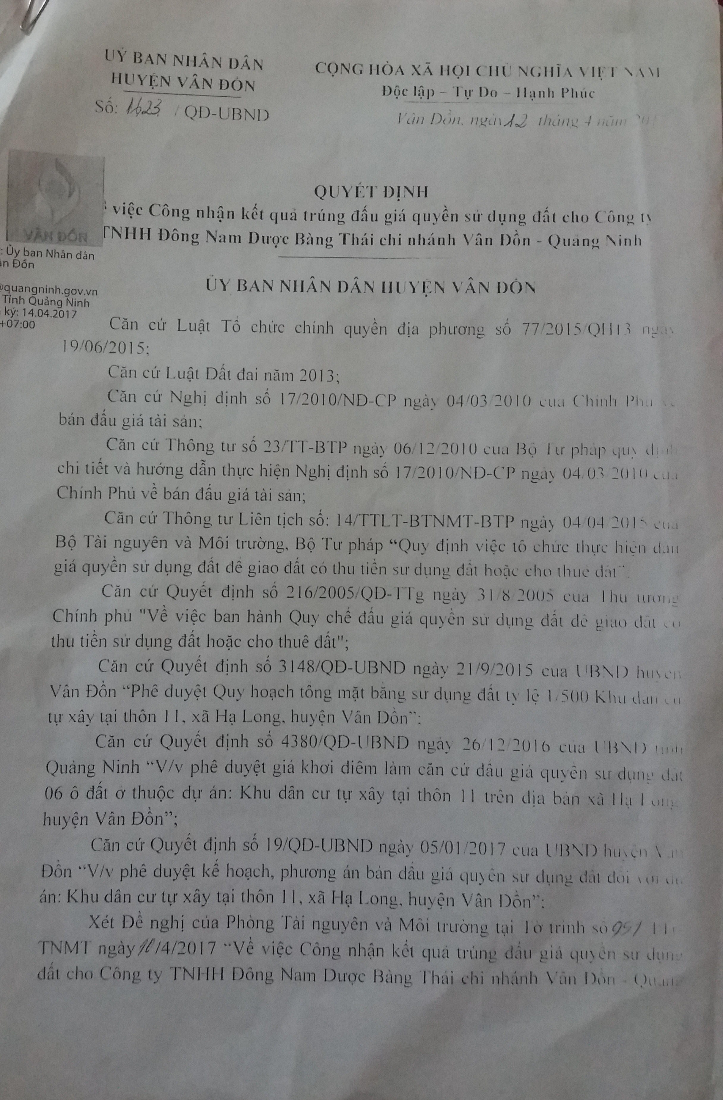 Sau phiên đấu giá, ngày 12/4/2017 phó chủ tịch Châu Thành Hưng đã ký quyết định công nhận kết quả trúng đấu giá quyền sử dụng đất. Quyết định công nhận kết quả trúng đấu giá quyền sử dụng đất tại các ô đất số 01, 02,03,04,05,06 thuộc quy hoạch mặt bằng chi tiết xây dựng tỷ lệ 1/500 khu dân cư tại thôn 11, xã Hạ Long, huyện Vân Đồn người trúng đấu giá là công ty TNHH Đông Nam TNHH Đông Nam Dược Bàng Thái chi nhánh Vân Đồn- Quảng Ninh địa chỉ tại (khu 2B, phường Cẩm Phú, TP Cẩm Phả, Tỉnh Quảng Ninh.