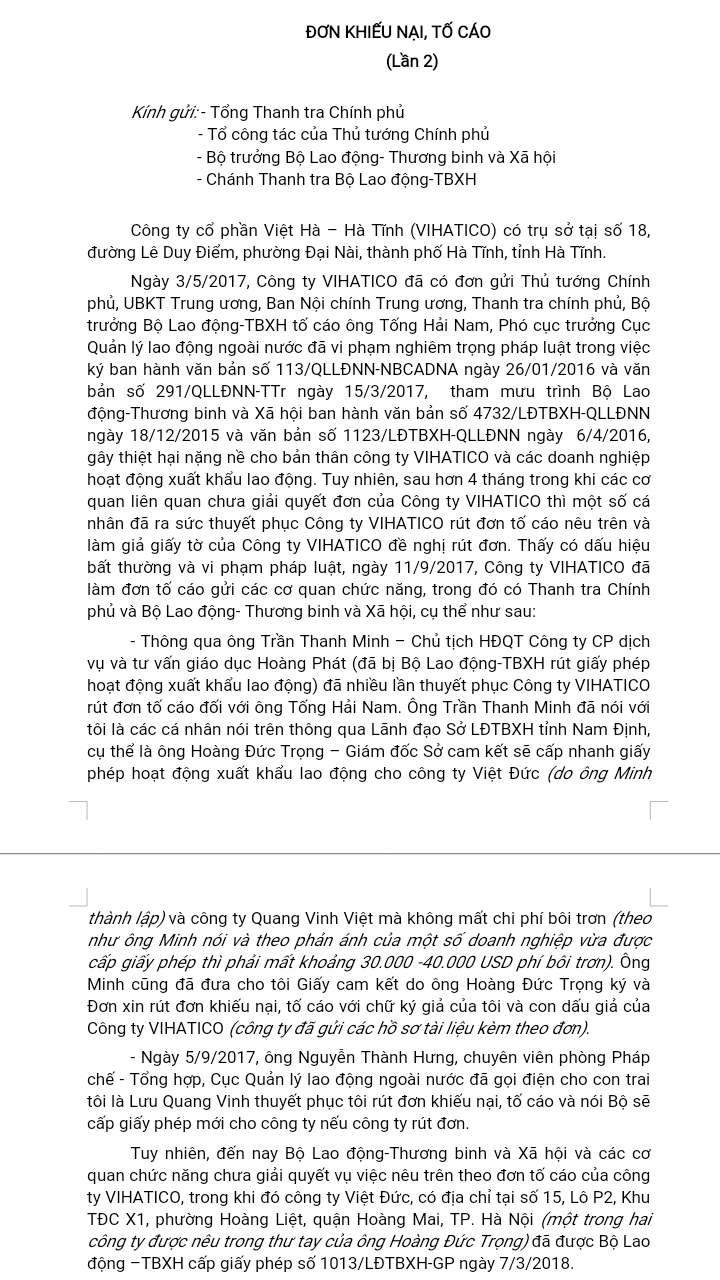 Theo đơn trình bày này của Công ty cổ phần Việt Hà – Hà Tĩnh (VIHATICO), ngày 3/5/2017, Công ty VIHATICO đã có đơn gửi Thủ tướng Chính phủ, UBKT Trung ương, Ban Nội chính Trung ương, Thanh tra Chính phủ, Bộ trưởng LĐ-TB&XH tố cáo ông Tống Hải Nam, Phó Cục trưởng Cục Quản lý lao động ngoài nước đã vi phạm nghiêm trọng pháp luật trong việc ký ban hành Văn bản số 113/QLLĐNN-NBCADNA ngày 26/01/2016 và Văn bản số 291/QLLĐNN-TTr ngày 15/3/2017, tham mưu trình Bộ LĐ-TB&X ban hành Văn bản số 4732/LĐTBXH-QLLĐNN ngày 18/12/2015 và Văn bản số 1123/LĐTBXH-QLLĐNN ngày 6/4/2016, gây thiệt hại nặng nề cho bản thân Công ty VIHATICO và các doanh nghiệp hoạt động xuất khẩu lao động (XKLĐ).